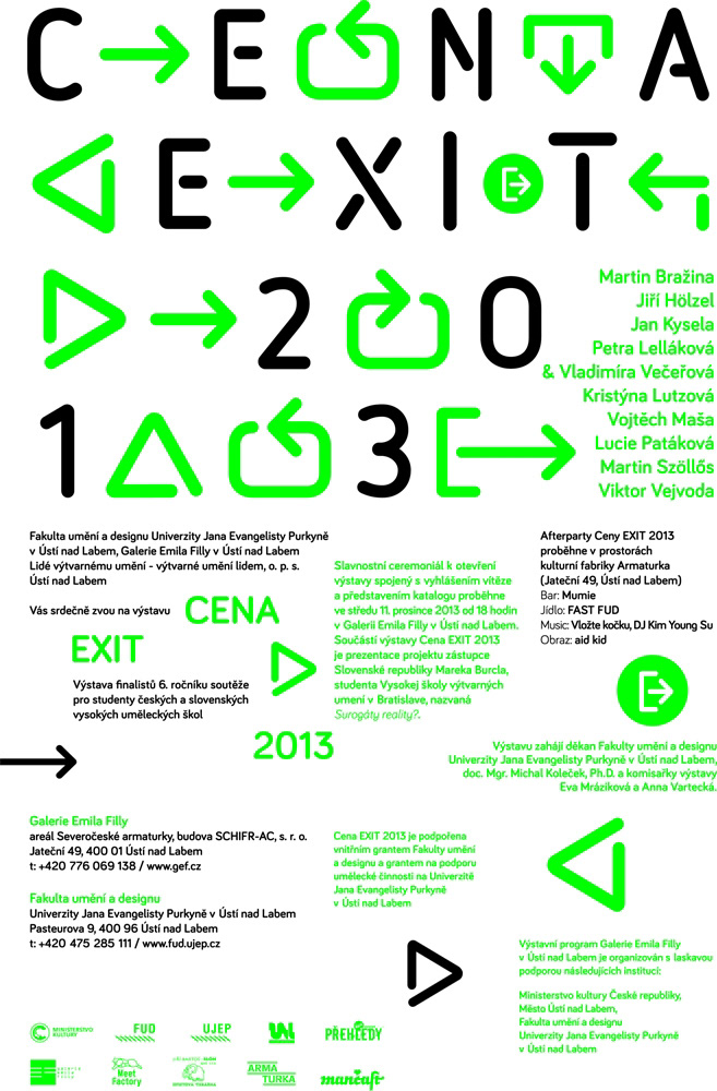 Výstava finalistů 6. ročníku soutěže pro studenty českých a slovenských vysokých uměleckých škol probíhá od 3.12.2013 do 30.1.2014. Součástí výstavy Cena EXIT 2013 je prezentace projektu zástupce Slovenské republiky Mareka Burcla, studenta Vysokej školy výtvarných umení v Bratislave, nazvaná ‘SUROGÁTY REALITY?’.